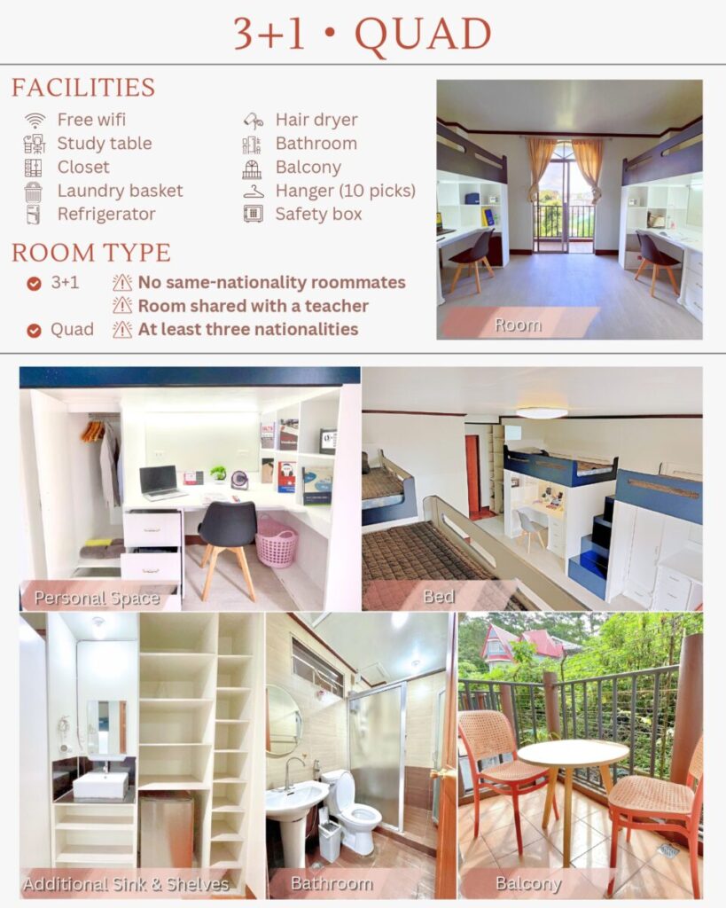 BECI SPARTAキャンパスでは、4人部屋のうち1人がフィリピン人講師、残り3人が国籍の異なる留学生となる「3+1」システムを採用しています。